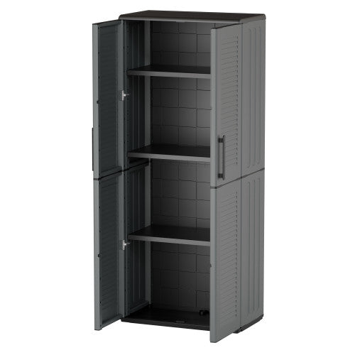 Armadio alto prodotto in polipropilene, materiale ri-ciclabile. dotato di cerniere in acciaio e ripiani interni regolabili, dimensioni 680x370xh 1630 mm.
