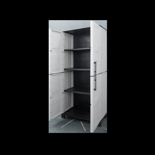 Armadio alto prodotto in polipropilene, materiale ri-ciclabile, dotato di cerniere in acciaio, ripiani interni regolabili e piedi, dimensioni 680x370xh 1690 mm.